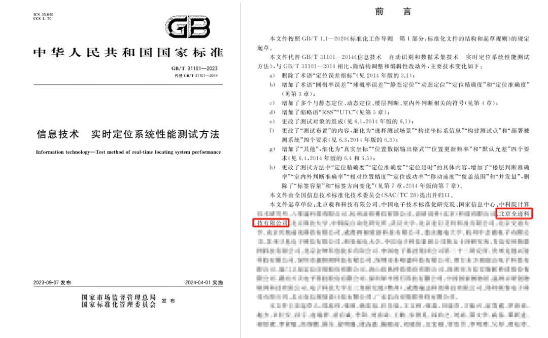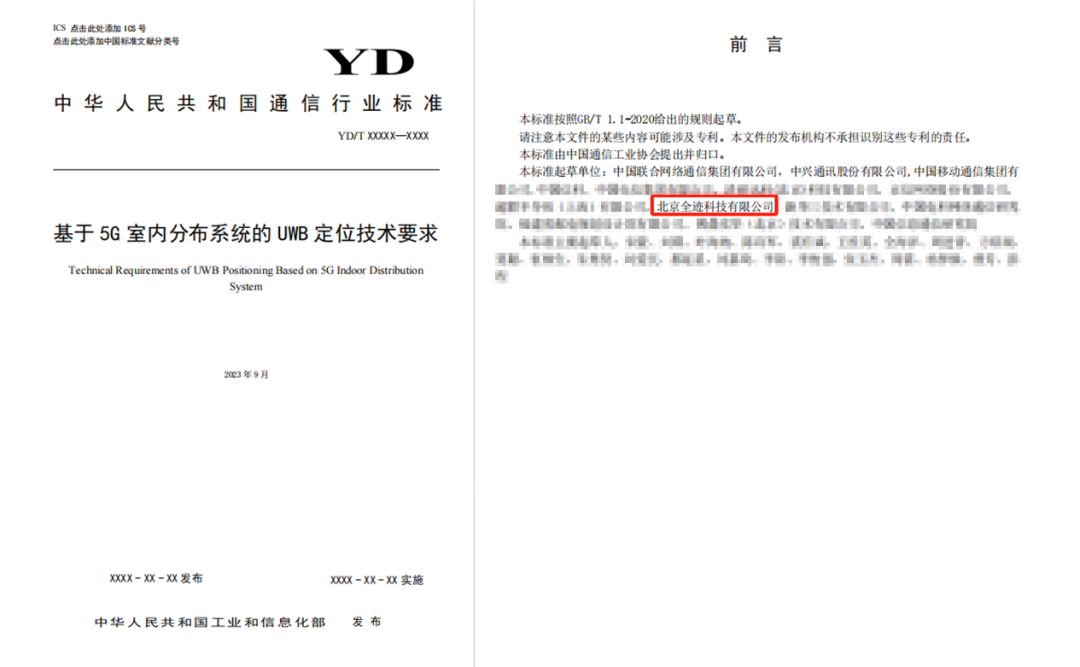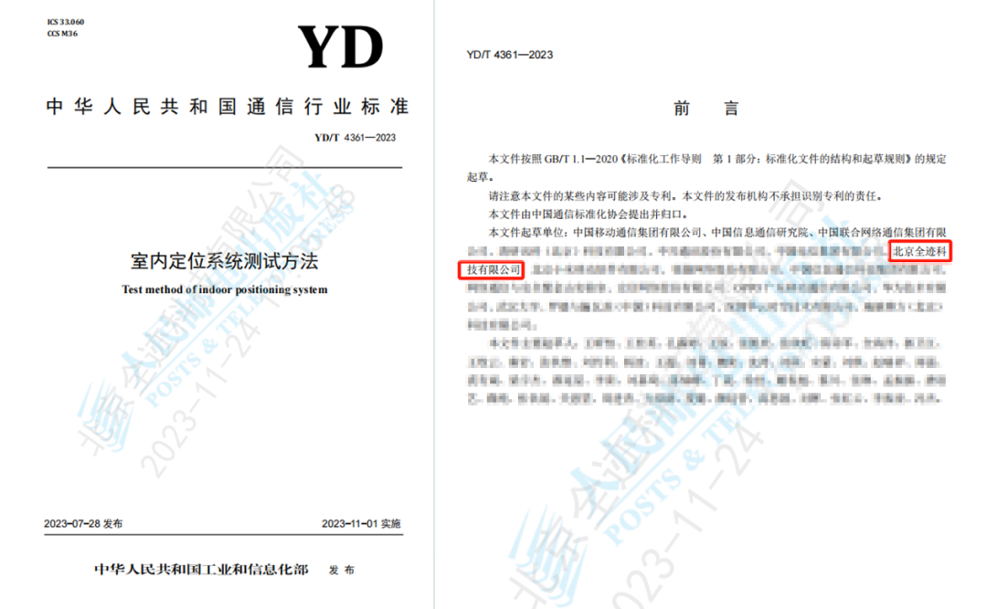 三、全跡科技參編制定《室內(nèi)定位系統(tǒng)測(cè)試方法》,該標(biāo)準(zhǔn)由中國(guó)通信標(biāo)準(zhǔn)化協(xié)會(huì)牽頭,移動(dòng)、聯(lián)通、信通院等企業(yè)參與起草。標(biāo)準(zhǔn)描述了室內(nèi)定位系統(tǒng)的測(cè)試環(huán)境及性能、系統(tǒng)功能的測(cè)試方法。該標(biāo)準(zhǔn)于2023年7月28日由中華人民共和國(guó)工業(yè)和信息化部發(fā)布,2023年11月1日實(shí)施。