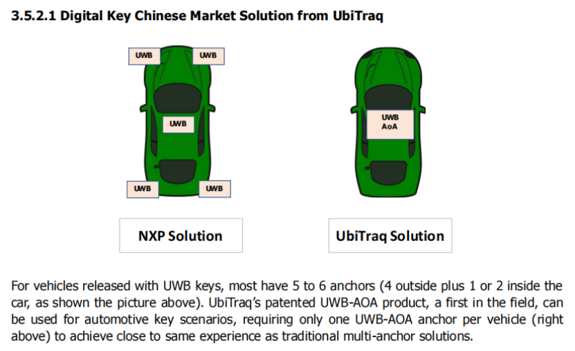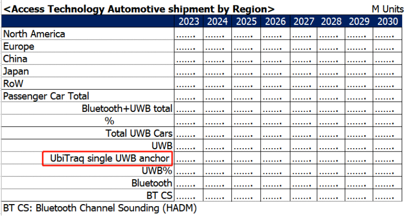 更重要的是,在新報告的汽車數(shù)字鑰匙出貨量預測中,全跡科技UWB-AOA產品被作為一項獨立技術,與傳統(tǒng)UWB、藍牙鑰匙并列(下表中的UbiTraq single UWB anchor),被單獨預測其出貨量與市場占有率。這是國際專業(yè)機構對全跡科技行業(yè)領先的創(chuàng)新能力、技術能力與產品能力的極大認可!