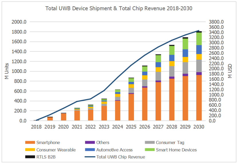 注:TSR(Techno Systems Research)是一家總部位于日本,面向全球的市場分析公司。TSR為客戶提供多個高科技領域深入的市場研究報告。TSR歷年發(fā)布了多份UWB市場分析報告,因其數(shù)據(jù)詳實豐富而聞名。其專業(yè)的統(tǒng)計數(shù)據(jù)經常被全球各類UWB行業(yè)分析文章引用,例如下面這張來自2022年TSR報告的插圖,相信行業(yè)內不少小伙伴都看過。