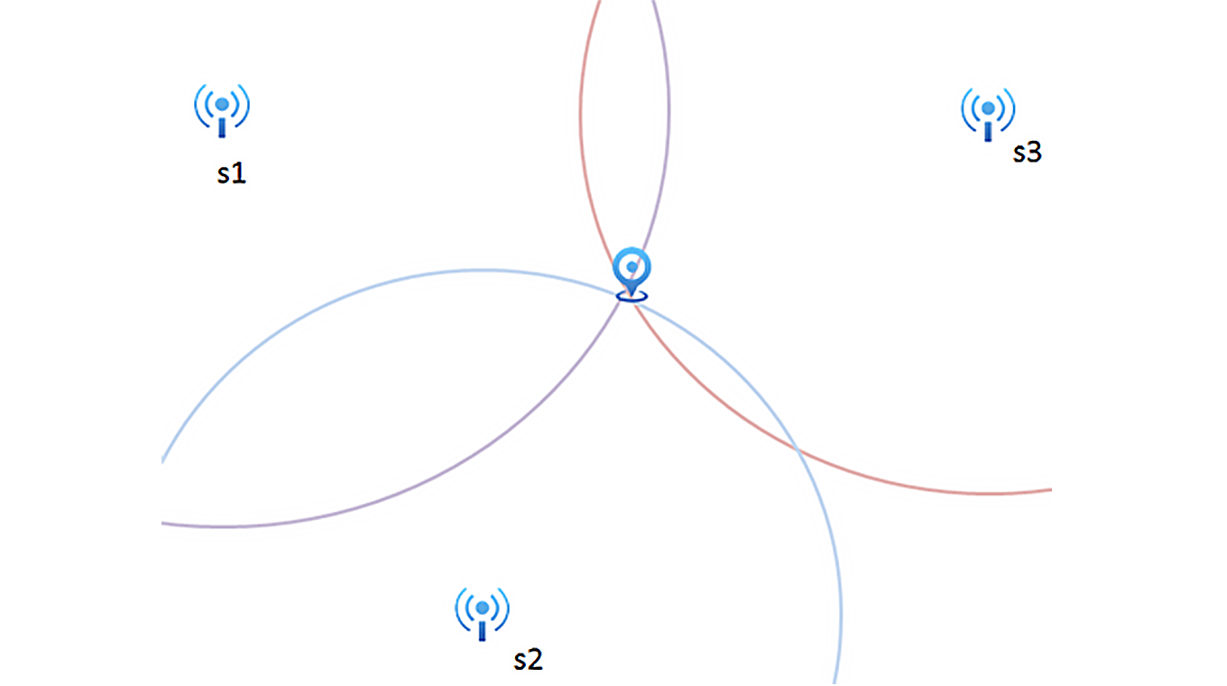 圖1-3是根據(jù)到各個(gè)基站的測距信息,以基站為中心畫圓,就可以得到一個(gè)交點(diǎn),交點(diǎn)就是標(biāo)簽的位置。