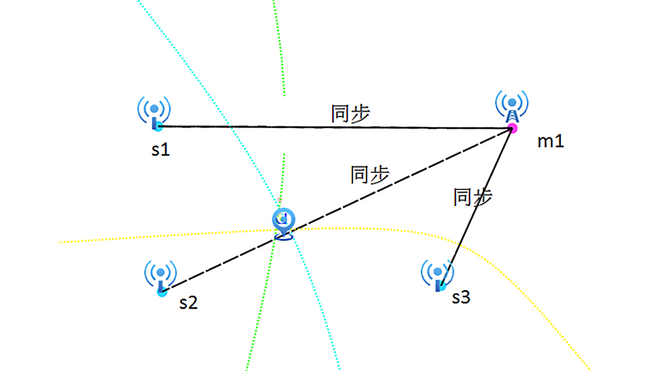 標(biāo)簽將數(shù)據(jù)包發(fā)送到被基站覆蓋的區(qū)域內(nèi),附近的所有基站都會(huì)收到標(biāo)簽的無線信號,但不會(huì)返回任何無線信號。由于基站與標(biāo)簽的距離間隔不同,因此消息在不同的時(shí)刻到達(dá)每個(gè)基站。這些時(shí)間差乘以空間中恒定的光速得到標(biāo)簽和基站之間的距離差,這樣就可以形成多點(diǎn)定位計(jì)算的基礎(chǔ),從而確定標(biāo)簽的相對坐標(biāo)。另外該技術(shù)的決定性因素是所有基站必須被同步。