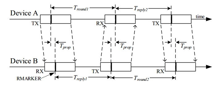 標(biāo)簽和基站之間會(huì)通過無線收發(fā)至少3次交互之后,可以得到標(biāo)簽和基站之間的距離信息。