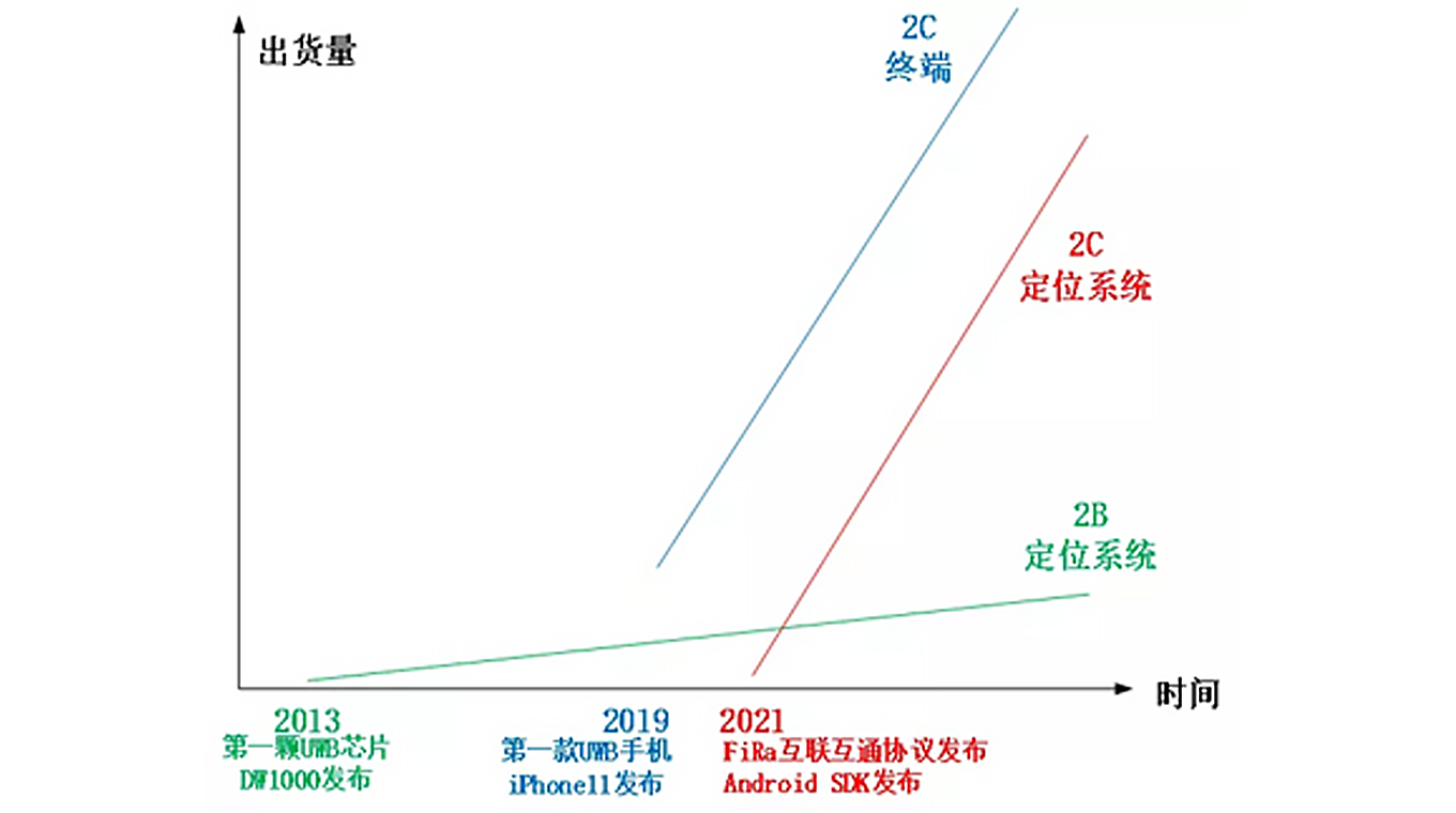 很多人說:新機會產(chǎn)生在行業(yè)變革期,UWB行業(yè)此刻就在發(fā)生大變革。從13年愛爾蘭Decawave(20年初被Qorvo收購)發(fā)布第一顆UWB芯片DW1000開始,很多公司基于該芯片做自己的UWB定位系統(tǒng);與大多數(shù)B端行業(yè)類似,UWB行業(yè)整體是平緩上升的曲線(圖中綠色線),是做項目的模式,不被大多數(shù)投資機構看好。